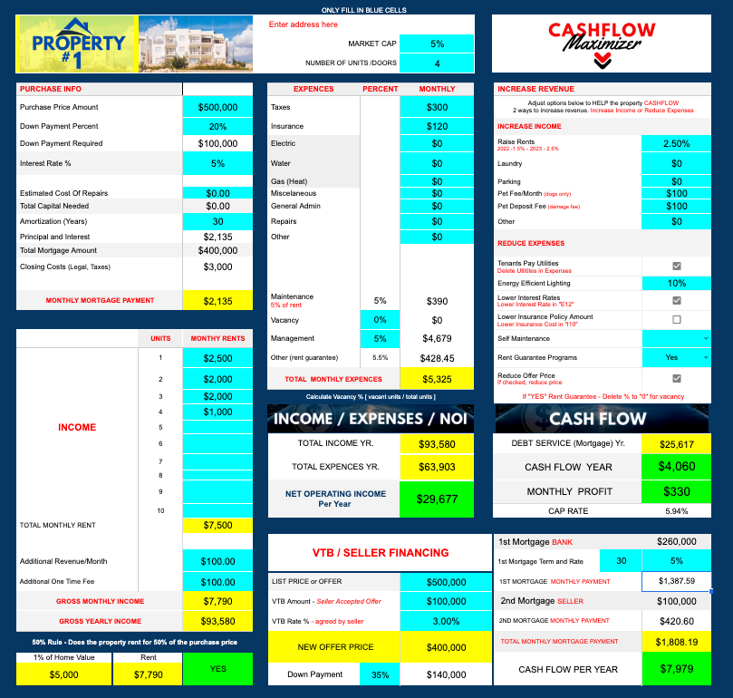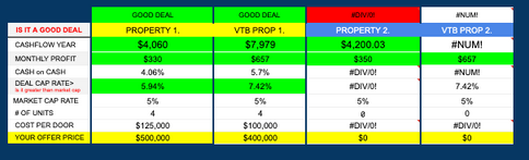 Analyze properties like a pro. Simply add some numbers and the spreadsheet GREEN $ RED lights lets you know if it's a GOOD or BAD deal.